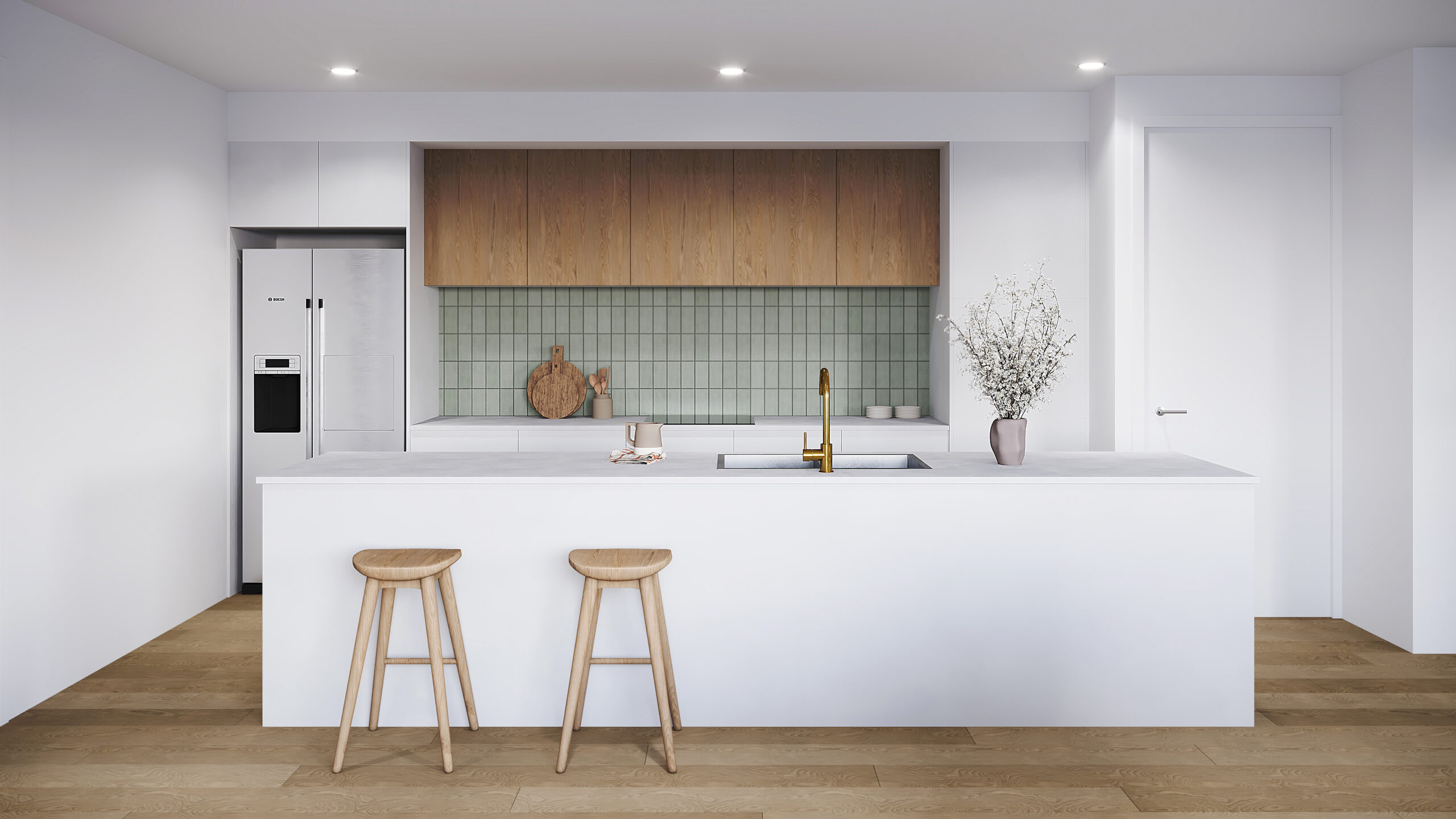 A refined scheme featuring rich green tones, brushed brass tapware and warm oak for a sophisticated, layered look.